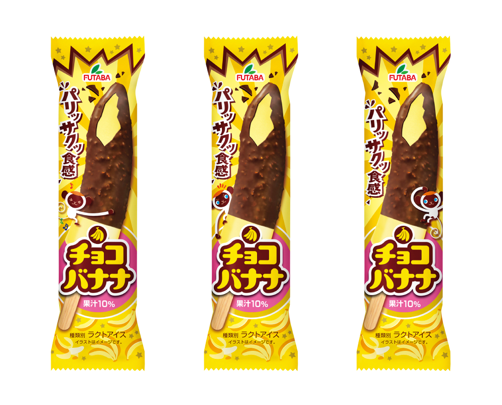 - チョコレートコーチング(国内製造)、水あめ、バナナピューレ、砂糖、脱脂粉乳、植物油脂、フィアンティーヌ、果糖、デキストリン、食塩 / 安定剤(増粘多糖類)、乳化剤、香料、クチナシ色素、(一部に小麦・乳成分・アーモンド・大豆・バナナを含む)