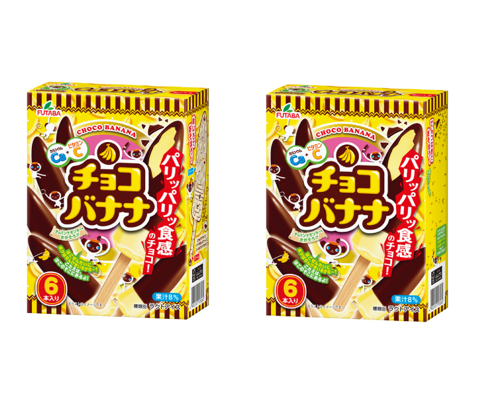 - 水あめ(国内製造)、チョコレートコーチング、バナナピューレ、砂糖、脱脂粉乳、植物油脂、果糖、デキストリン、食塩 / 炭酸Ca、安定剤(増粘多糖類)、乳化剤、ビタミンC、香料、クチナシ色素、(一部に乳成分・アーモンド・大豆・バナナを含む)